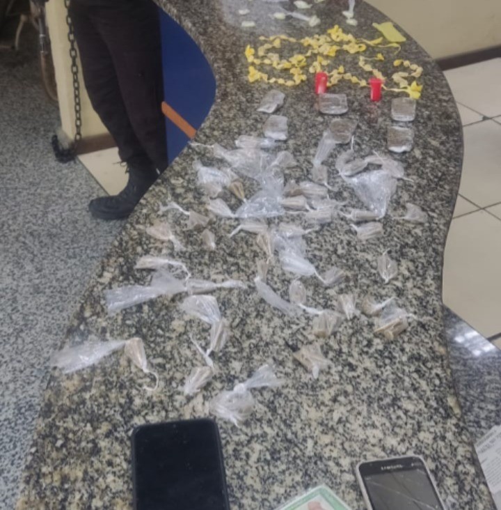 Ao todo, foram apreendidos 106 cápsulas de cocaína, seis tabletes pequenos de maconhas, 106 pedras de crack e dois celulares.